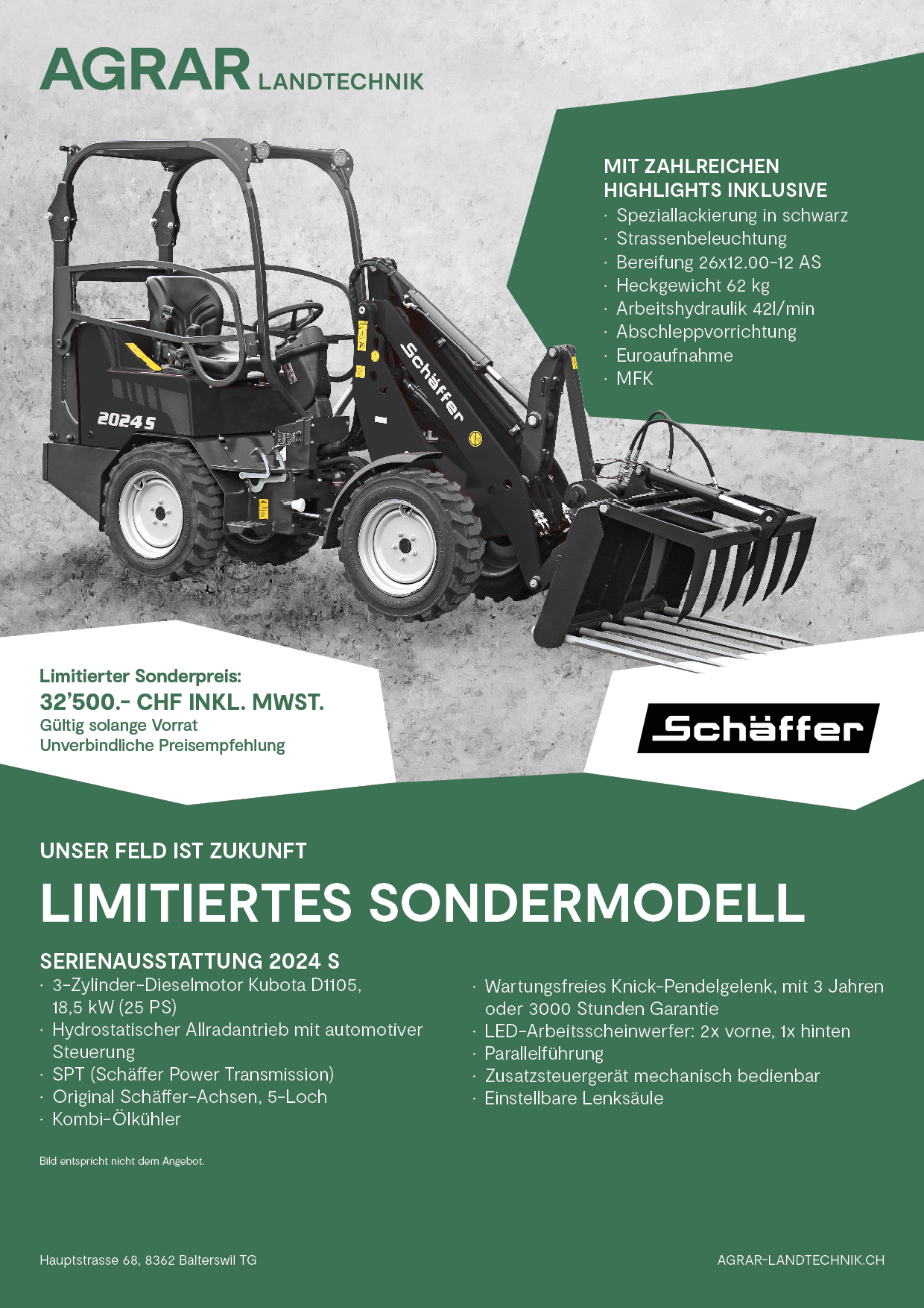 Ab sofort ist bei der Agrar Landtechnik AG die exklusive Schäffer 2024 S Limited Edition erhältlich – zum Sonderpreis von 32’500.– CHF inkl. MwSt. (solange Vorrat).